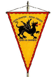 The Grand Ensign was the real flag of the Ku Klux Klan. In Klan prescripts the flag was described to be a triangle that was 3' by 5' madde of Yellow material with a 3'' scaloped border of red material. The original was hand painted with a Latin motto and European flying dragon colored black. The Latin motto was- Quod Semper, Quod Ubique, Quod Ab Omnibus. In english it means, "what always, what everywhere, what by all is held to be true. Only two surviving flags can tell us what the KKK banner looked like. One is in Pulski, Tennessee owned by thr Tennessee Historical Society at Nashville; the other is owned by the Confederate Museum in Richmond, Virginia.